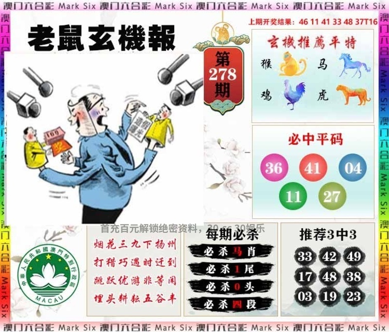 282期:天地两肖【天肖+虎鸡】开:牛41准 |